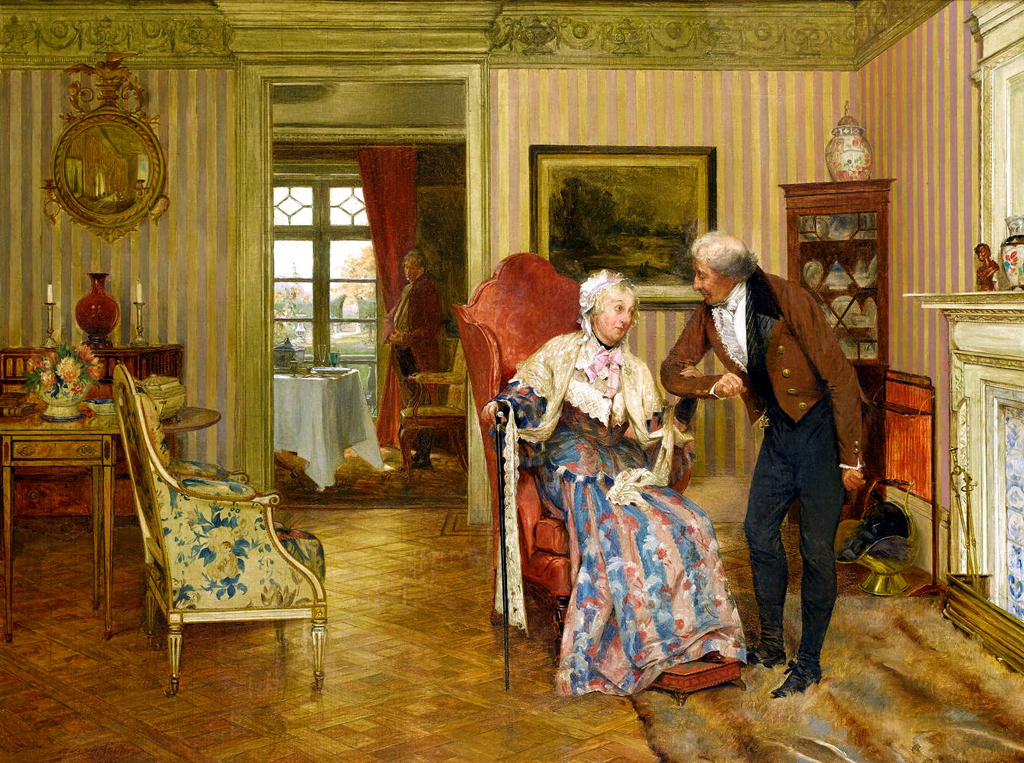 He exhibited at the Dudley Gallery from 1872 and at the Royal Academy from the following year through to the 1890s. He was a member of the RBA, he also exhibited at the RA (Royal Academy). He painted contemporary people in domestic and daily life pursuits, showing them with comical expressions illustrating their greed, stupidity etc. His subjects were usually set in the late eighteenth or early nineteenth centuries with sentimental, romantic and humorous themes. Before painting a scene he would create elaborate settings in which local villagers would often pose as models. Indeed, as he often used the same props and models, these can sometimes be seen repeated in successive paintings in different guises. The home, the inn, the lawyers office, the garden and the golf course all provide subjects for his wit and clever social observation.